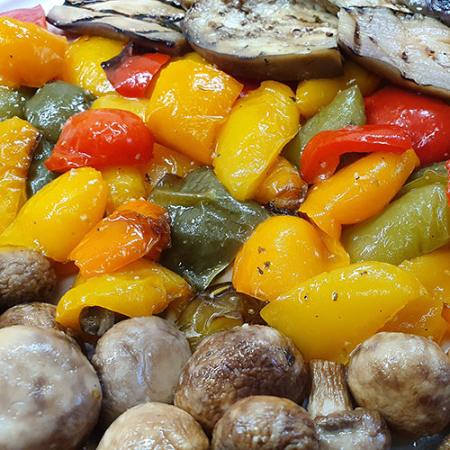 Frische Paprika, Zucchini, fruchtige Cherrytomaten, Champignons und rote Zwiebeln mit einem Hauch Knoblauch, Olivenöl und mediterranen Kräutern