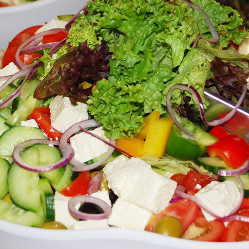 Knackiger Eisbergsalat, Blattsalate der Saison, Tomaten, Gurken, Paprika, Oliven, Fetakäsewürfel und rote Zwiebeln
