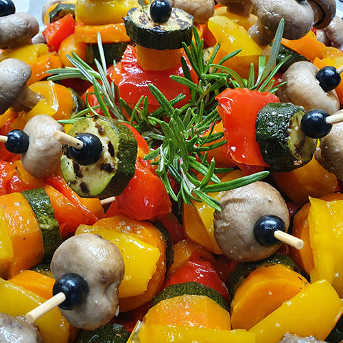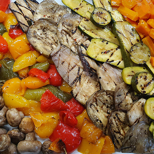 Auberginen, Zucchini, Paprika, Karotten, rote Zwiebeln, Champignons