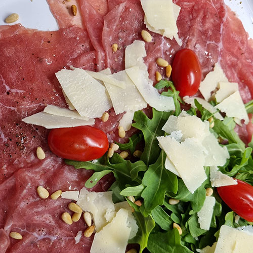 lecker mariniert, mit knackigem Rucola, fruchtigen Cherrytomaten, Grana Padano und gerösteten Pinienkernen